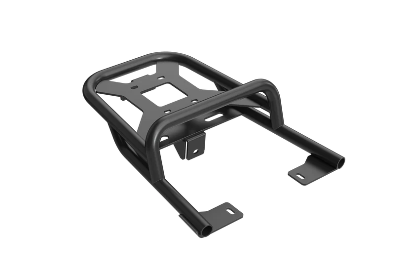 The rear rack is an easy-to-install accessory that can be securely attached to the aluminum frame. It features passenger handholds.